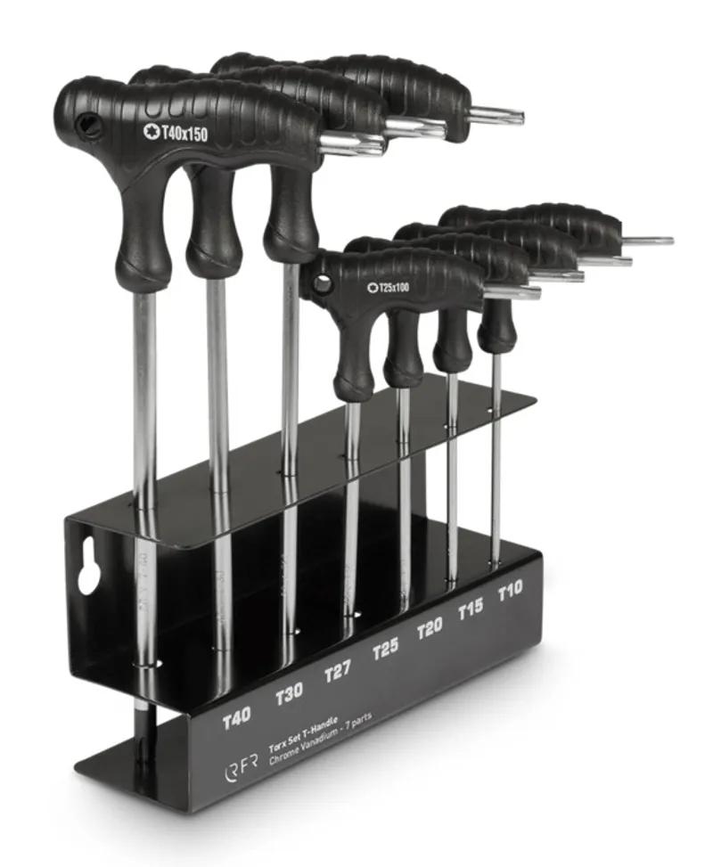 7-piece set of hexagon socket screws with T-shaped thermoplastic handle. Includes T10 / T15 / T20 / T25 / T27 / T30 and T40 keys.