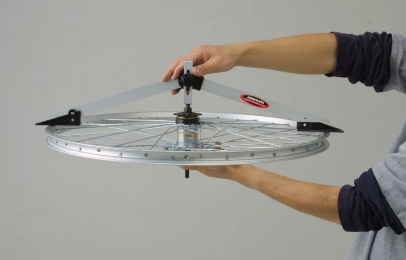 Neat compact foldable tool for ensuring wheel symmetry and correct dish after truing. Compatible with road and mountain bike wheels.