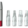 - Ergonomic handle design provides comfort and control and stores extra bits