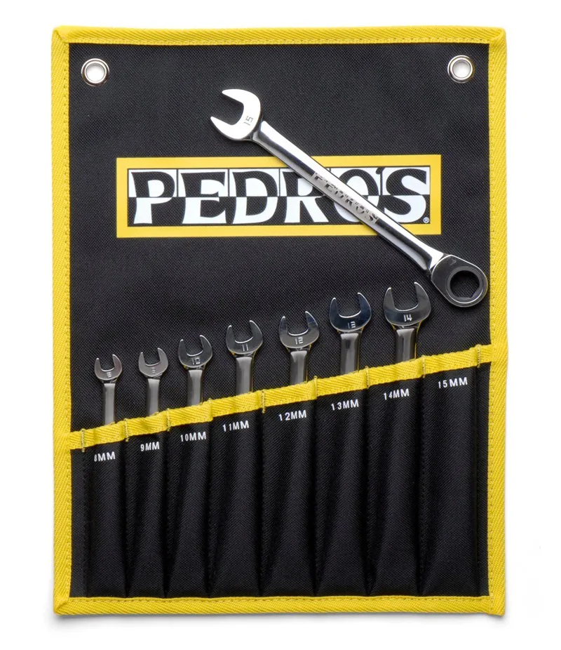 The Pedro's Ratcheting Combo Wrench Set features beautiful, compact, and durable spanner wrenches. The forged and polished wrenches feature a convenient combination of six point ratchet box-end and offset open-end.