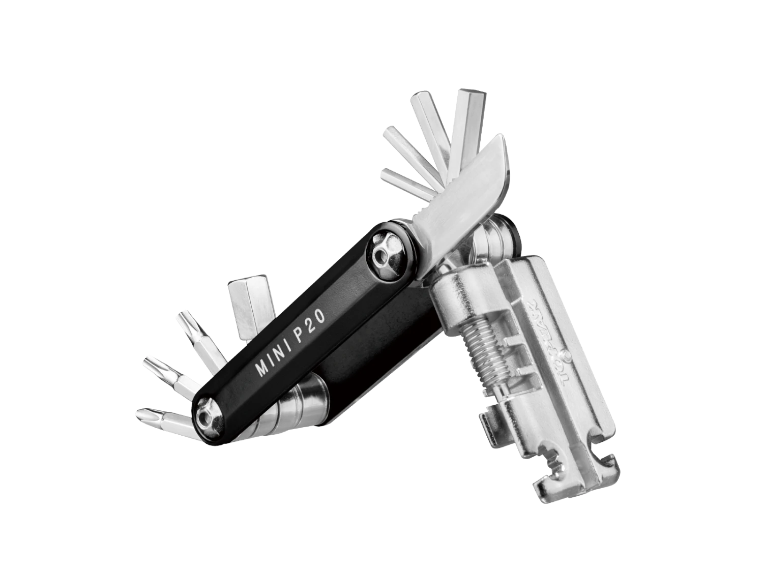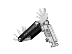 20 function pro-quality, precision mini tool with sleek forged alloy body. Integrated easy-to-use chain tool combined with a unique power link tool which folds away for a streamlined profile. Perfect for long road rides or endurance mountain biking. Includes a neoprene bag for protection.